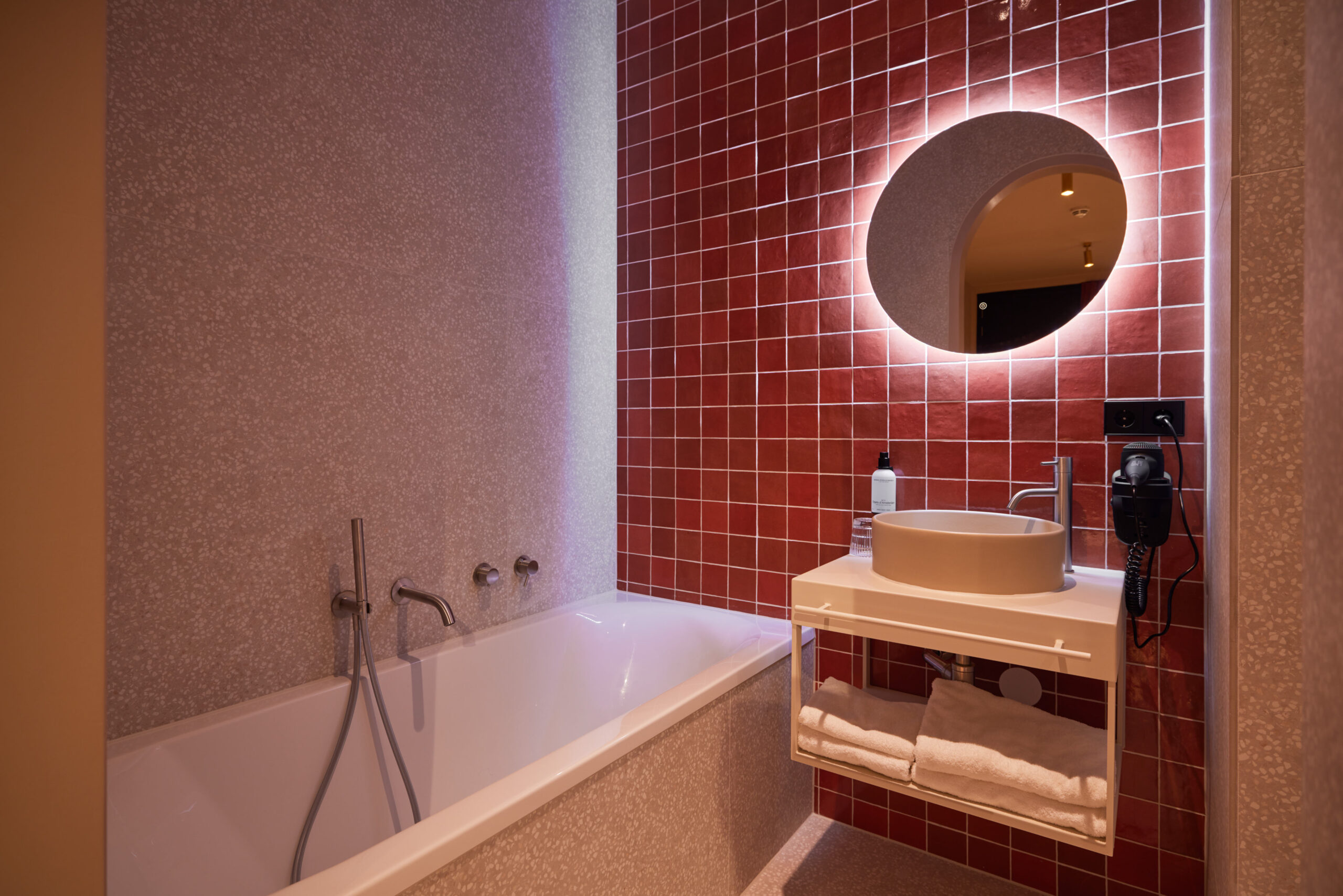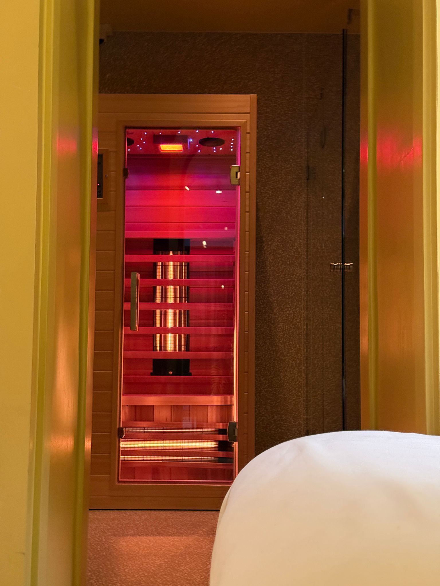 Diese Zimmer von etwa 30,4 m² sind ganz auf Luxus und Wellness ausgerichtet und verfügen über eine Infrarot-Saunakabine, zwei großzügige Regenduschen und ein luxuriöses Kingsize-Bett. Das Zimmer bietet außerdem eine stilvolle Sitzecke, einen praktischen Arbeitsbereich, schnelles WLAN und einen 42″ LED-Fernseher.