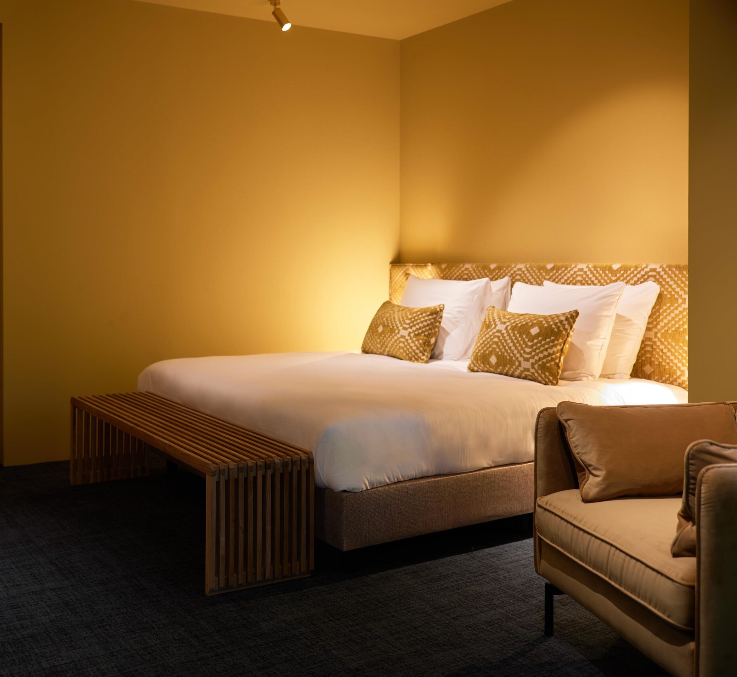 Unter dem himmlischen Schieferdach des Heavens Hotel finden Sie 43 luxuriöse Zimmer und eine Honeymoon-Suite. Alle acht Zimmertypen strahlen Luxus und Komfort aus. Wählen Sie ein Kingsize-Bett, zwei Einzelbetten, ein Zimmer mit Schlafcouch für einen dritten Gast oder ein Familienzimmer für vier Personen. Weiche Materialien und satte Farben umhüllen Sie wie eine warme Decke. Authentische Elemente der monumentalen Kirche wie Säulen und rotverglaste Fenster sorgen für eine reiche, historische Atmosphäre. In diesem Paradies auf Erden fühlt sich jeder Gast wie ein Adeliger. Die hohen Fenster auf der Flurseite bieten indirektes Tageslicht und einen einzigartigen Blick auf die bunten, monumentalen Elemente der Kirche. Die stimmungsvollen Vorhänge sorgen für zusätzliche Privatsphäre.